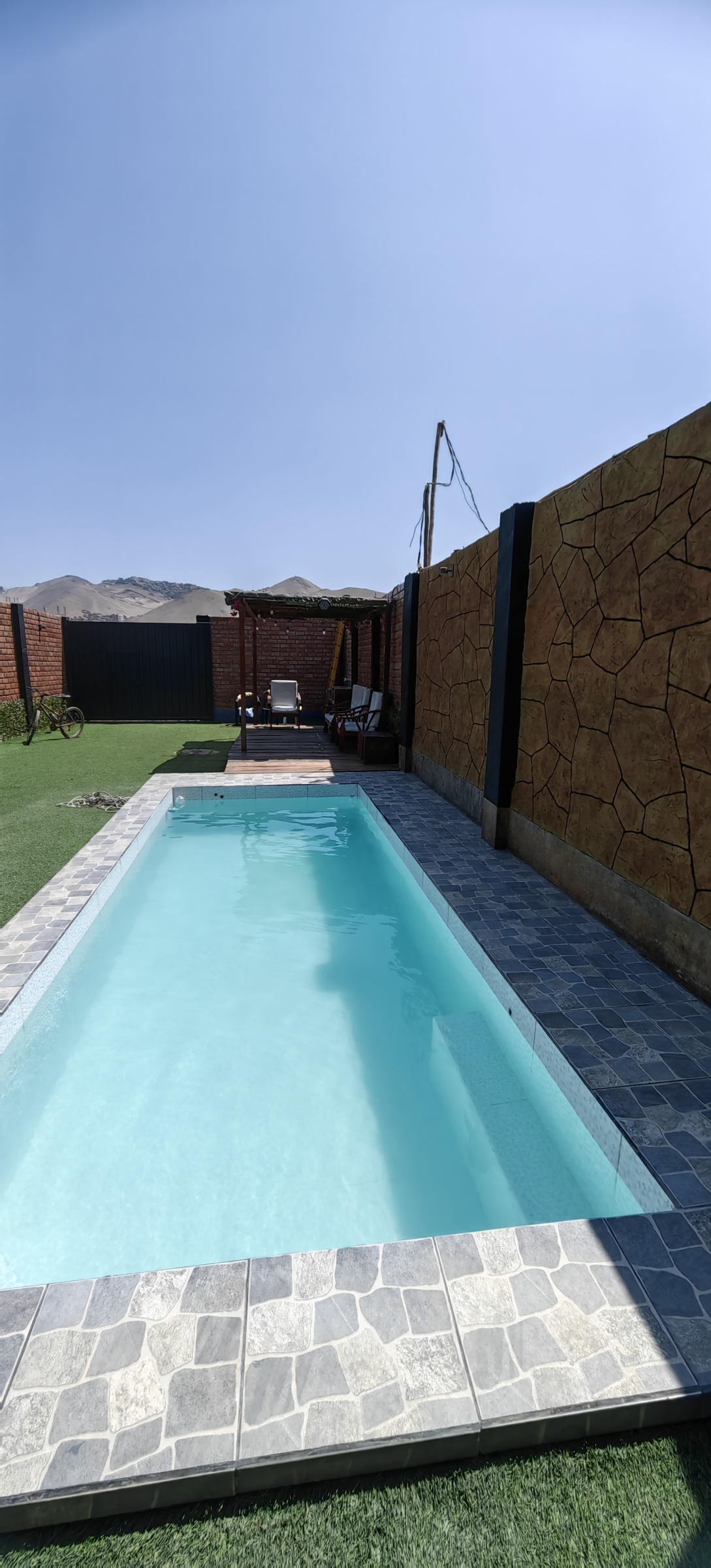 - Piscina mediana de 6 x 2.5 x 1.5 en pendiente en concreto armado y color azul turquesa caribe.