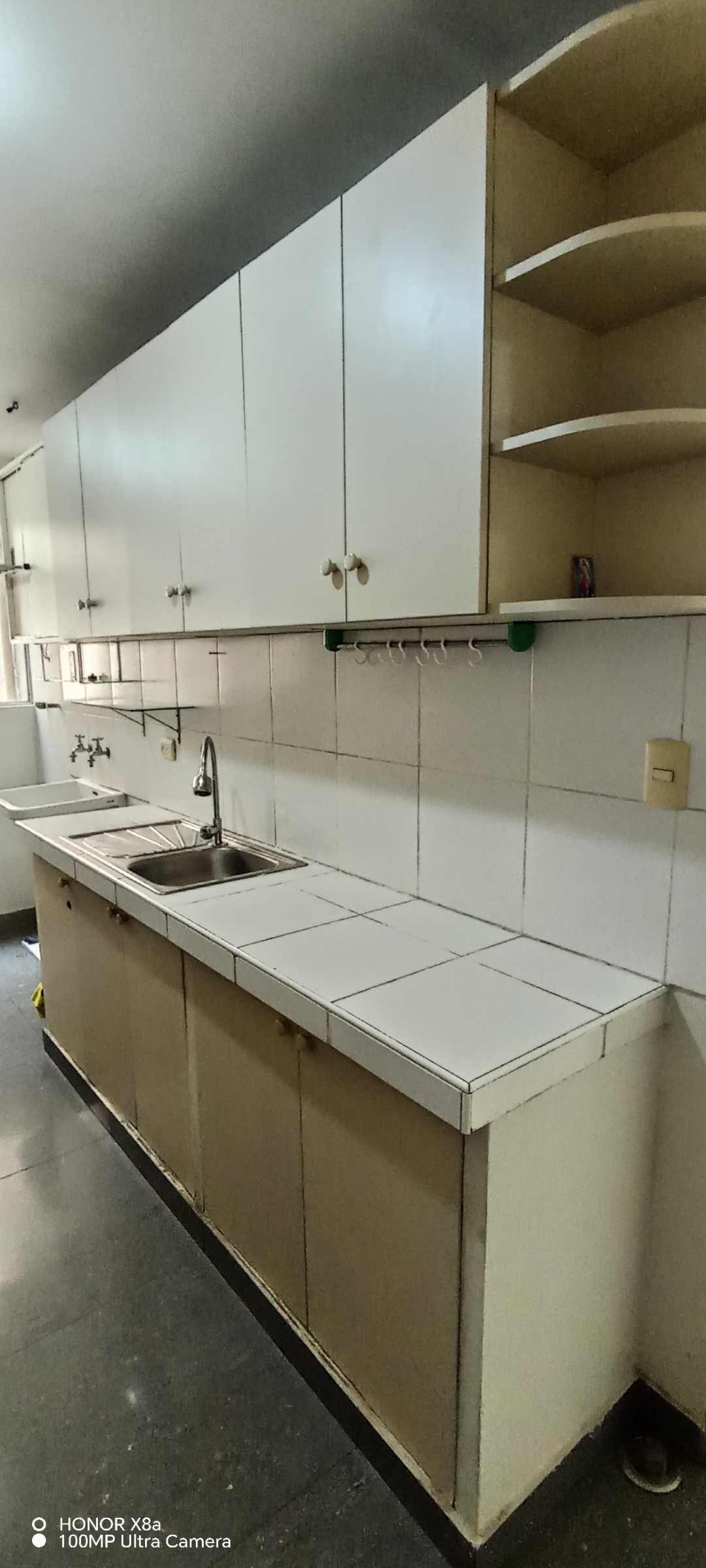 Una cocina con módulos altos y bajos y una lavandería ventilada por un gran tragaluz y con conexión para agua caliente.