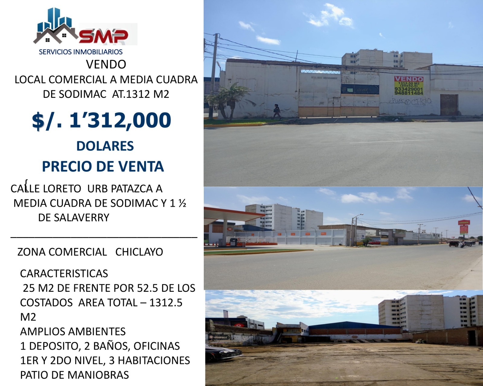 VENDO LOCAL COMERCIAL 1312 M2 A MEDIA CUADRA DE SODIMAC, COSTADO DE GRIFO URB PATAZCA CHICLAYO